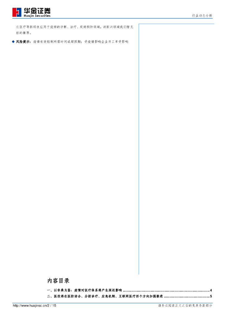华金证券:医药行业动态分析:疫情推动体系医疗体系深远变化,看好医防结合、分级诊疗、应急管理和互联网医疗四个方向.pdf