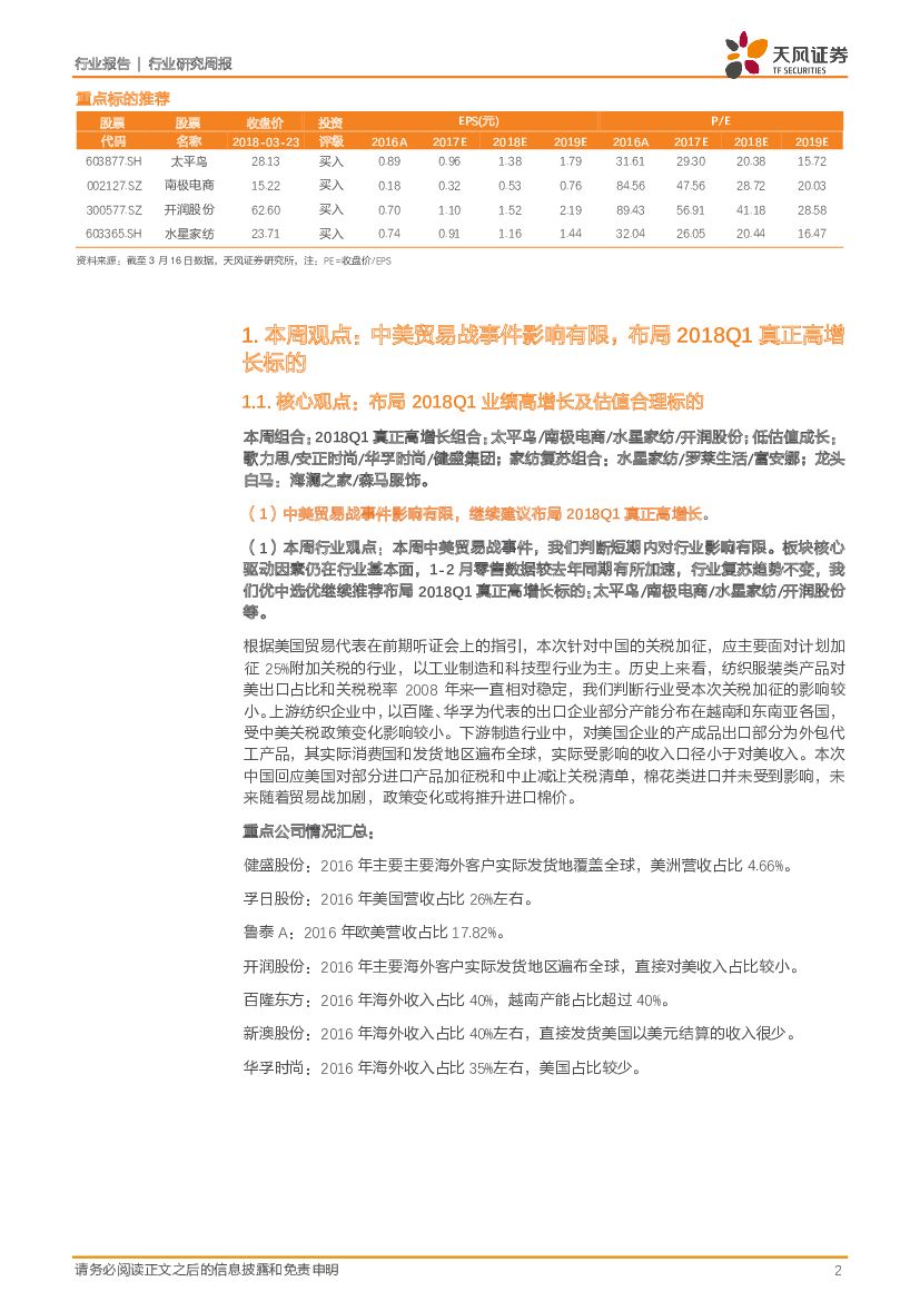 天风证券:纺织服装行业研究周报:中美贸易战短期对行业影响有限,继续推荐2018Q1业绩高增长且估值合理标的.pdf
