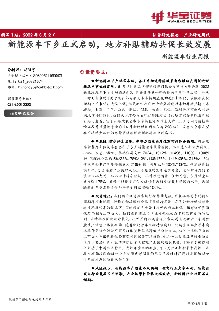 华宝证券:新能源车行业周报:新能源车下乡正式启动,地方补贴辅助共促长效发展.pdf