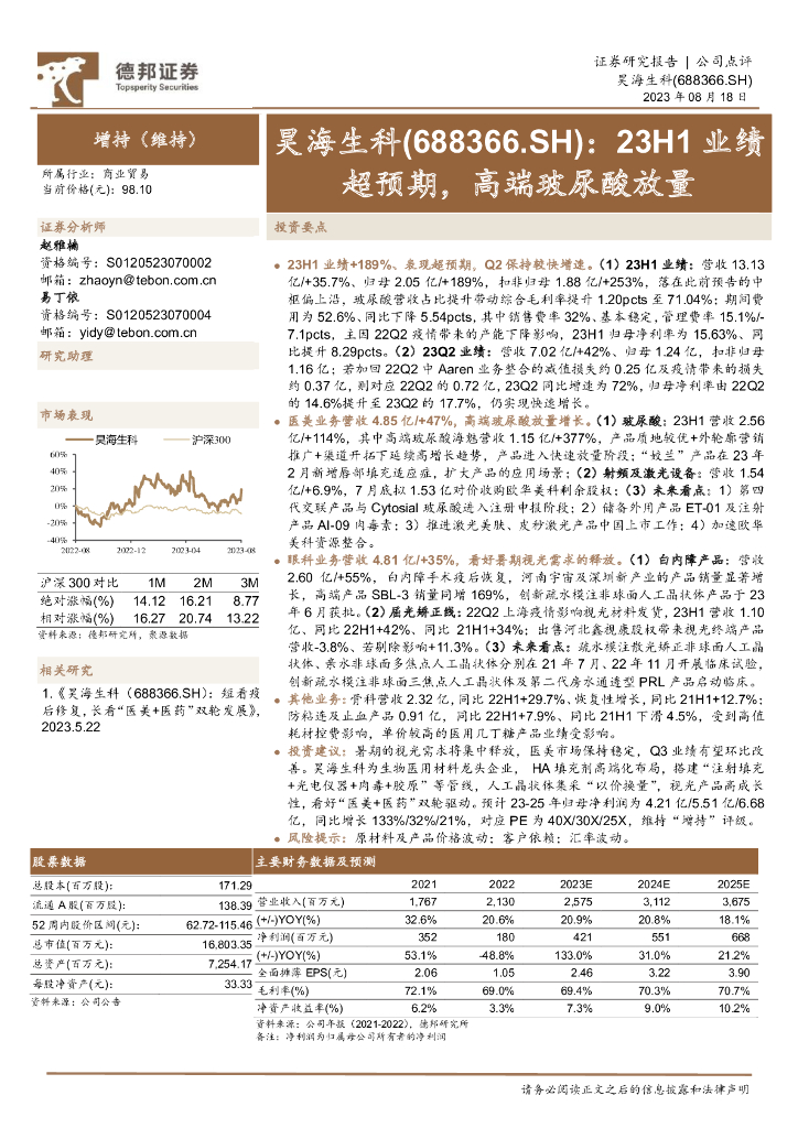 德邦证券:昊海生科(688366)-23H1业绩超预期,高端玻尿酸放量.pdf
