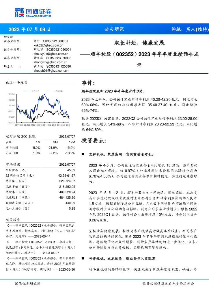 国海证券:顺丰控股(002352)-2023年半年度业绩预告点评:取长补短,健康发展.pdf