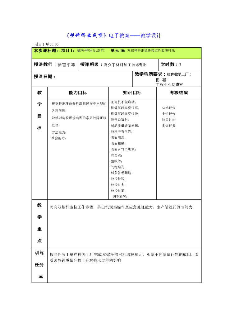 《塑料挤出成型》电子教案-单元10:双螺杆挤出机造粒过程故障排除.pdf