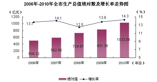 经济总量迈上新台阶。初步测算,2010年全市生产总值(GDP)1032.06亿元,按可比价格计算,比上年增长14.3%。其中第一产业增加值98.04亿元,增长3.8%;第二产业增加值579.71亿元,增长17.0%;第三产业增加值354.32亿元,增长14.0%。人均生产总值21487元,增长13.6%。三次产业结构由上年的11.0:53.1:35.9调整为9.5:56.2:34.3,第二产业的主导作用继续增强。工业增加值占GDP的比重达46.4%,比上年提高4.1个百分点,工业化进程不断加快。