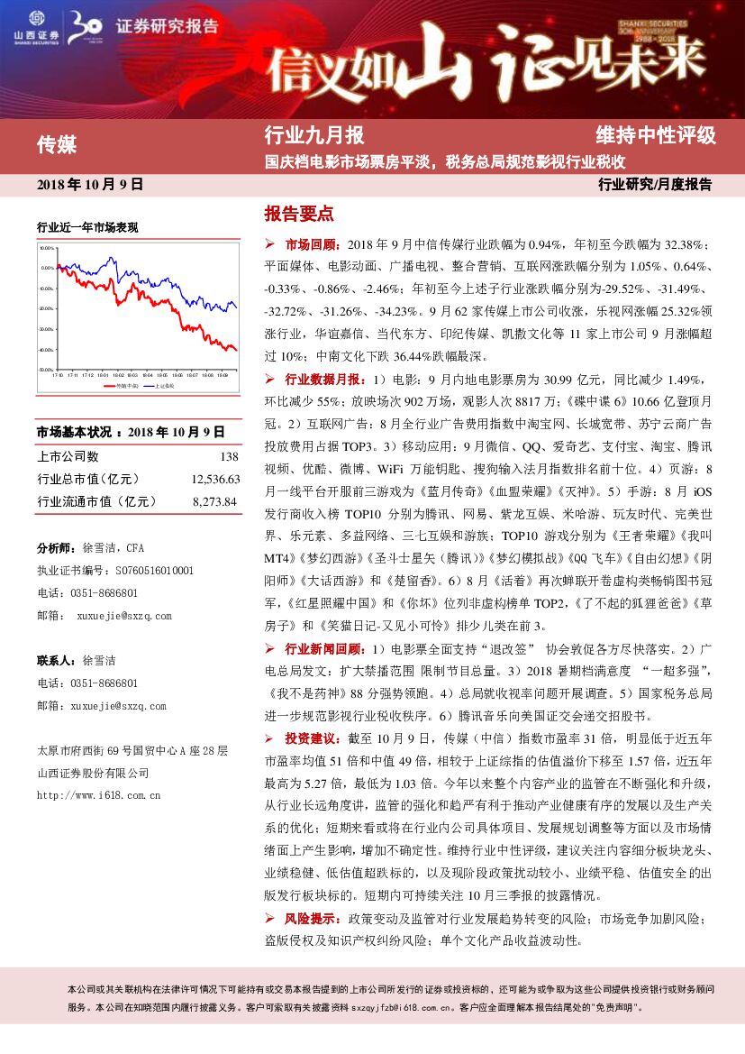 山西证券:传媒行业九月报:国庆档电影市场票房平淡,税务总局规范影视行业税收.pdf