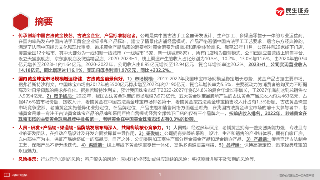 民生证券:商贸社服:“庖丁解牛”拆析招股书(二十)-老铺黄金:秉持高端定位,中国古法手工金器专业第一品牌.pdf