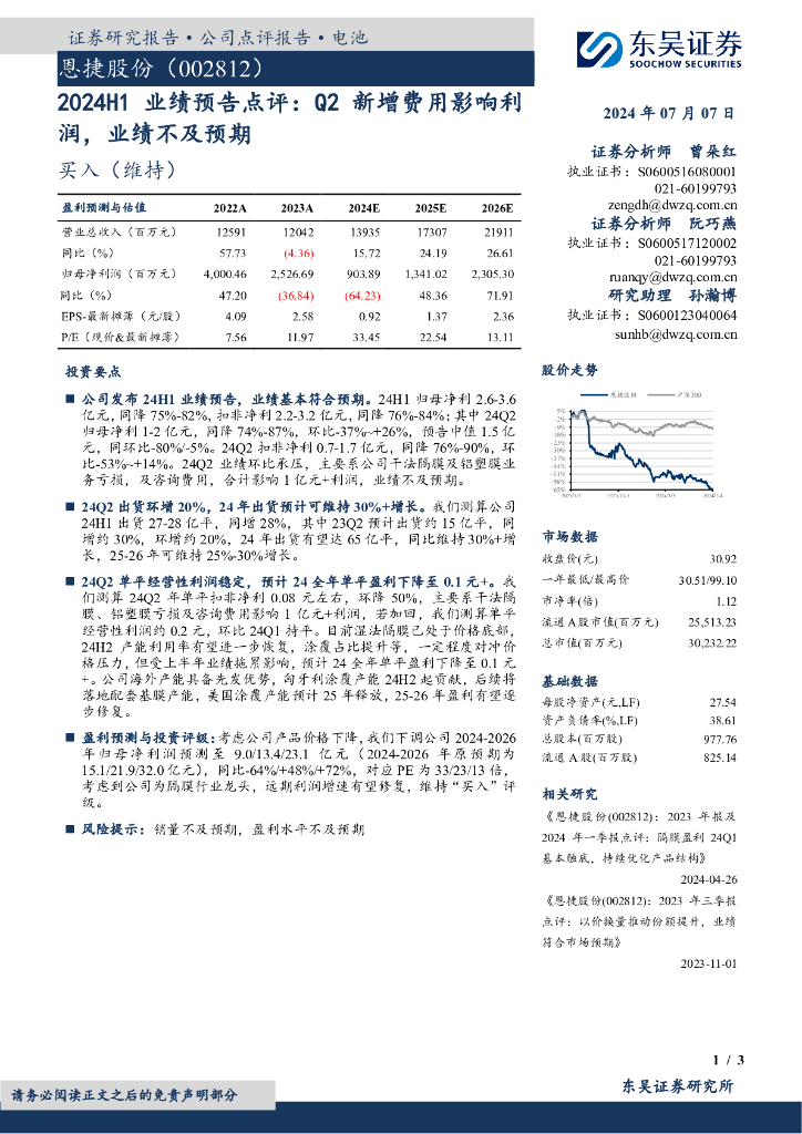 东吴证券:恩捷股份(002812)-2024H1业绩预告点评:Q2新增费用影响利润,业绩不及预期.pdf