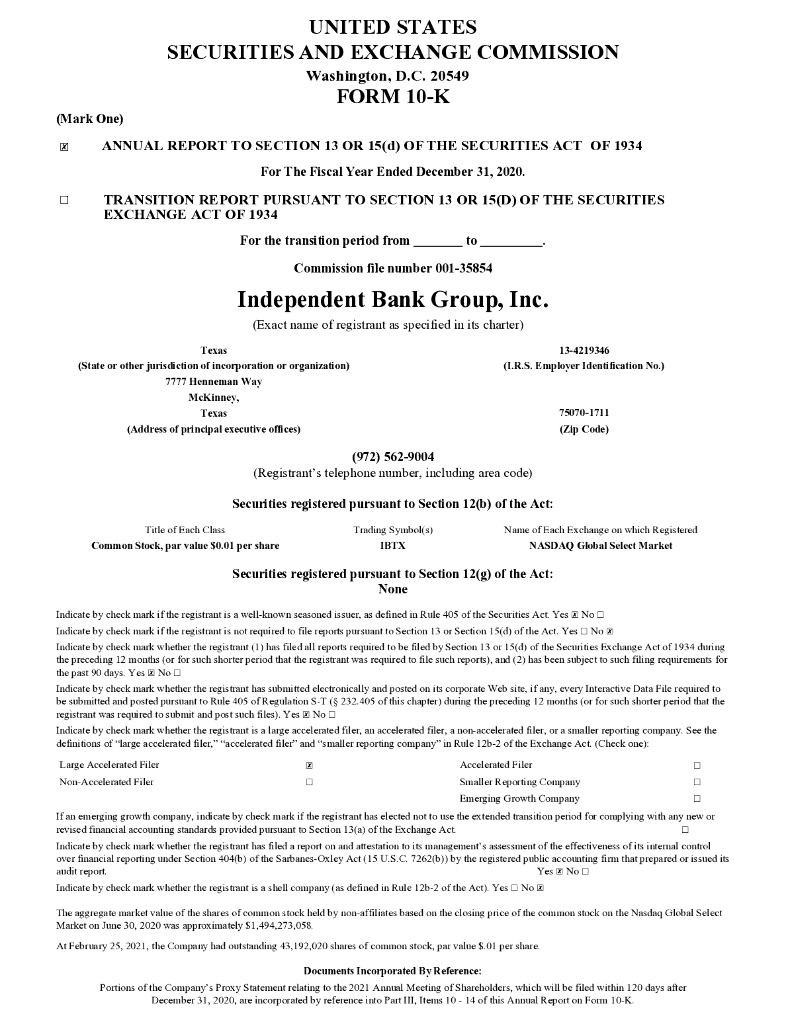 Independent Bank Group Inc(IBTX)2020财年年度报告(英文版).pdf