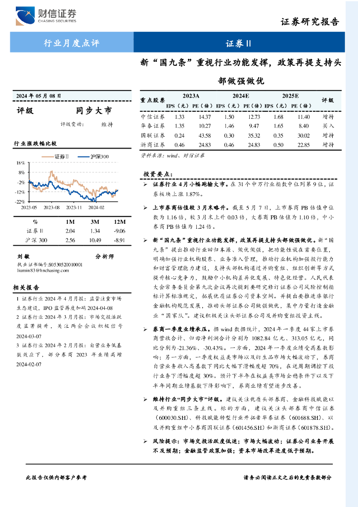 财信证券:证券Ⅱ行业月度点评:新“国九条”重视行业功能发挥,政策再提支持头部做强做优.pdf