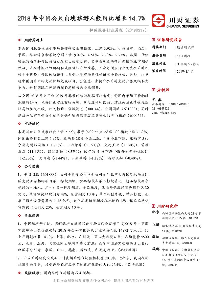 川财证券:休闲服务行业周报:2018年中国公民出境旅游人数同比增长14.7%.pdf