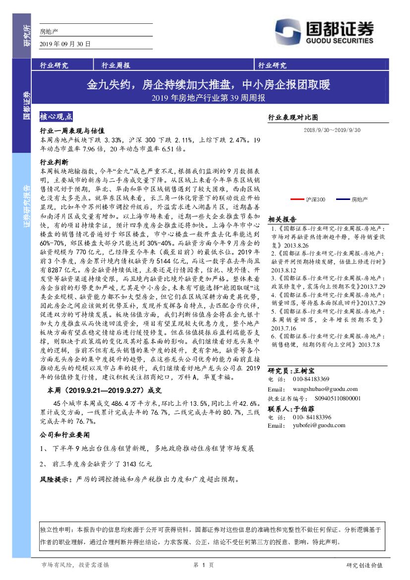 国都证券:2019年房地产行业第39周周报:金九失约,房企持续加大推盘,中小房企报团取暖.pdf
