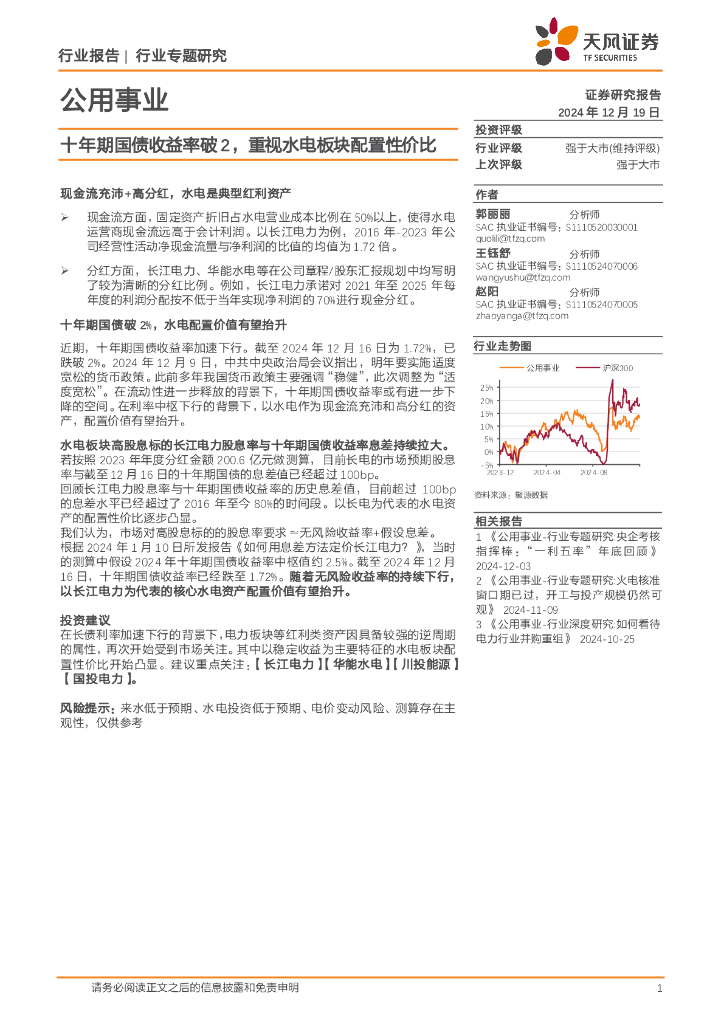 天风证券:公用事业行业专题研究:十年期国债收益率破2,重视水电板块配置性价比.pdf