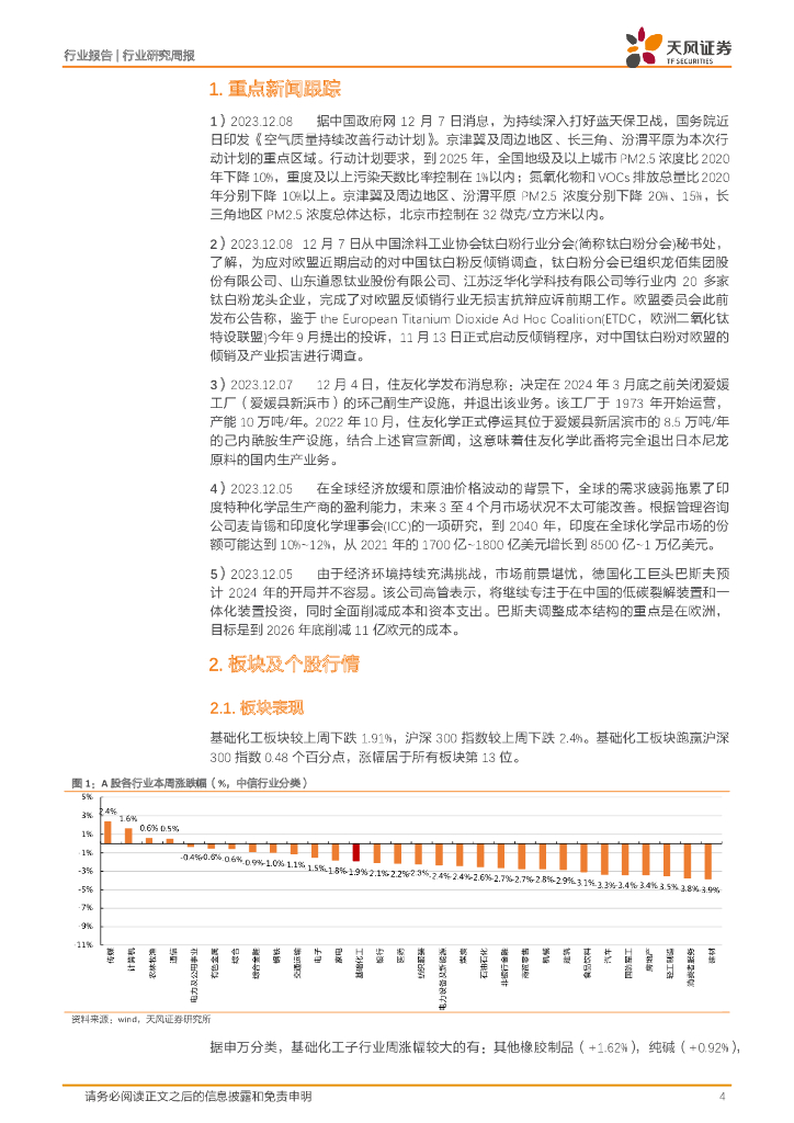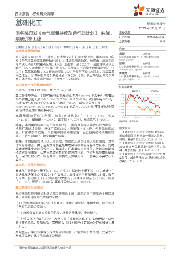天风证券:基础化工行业研究周报:国务院印发《空气质量持续改善行动计划》,纯碱、醋酸价格上涨.pdf