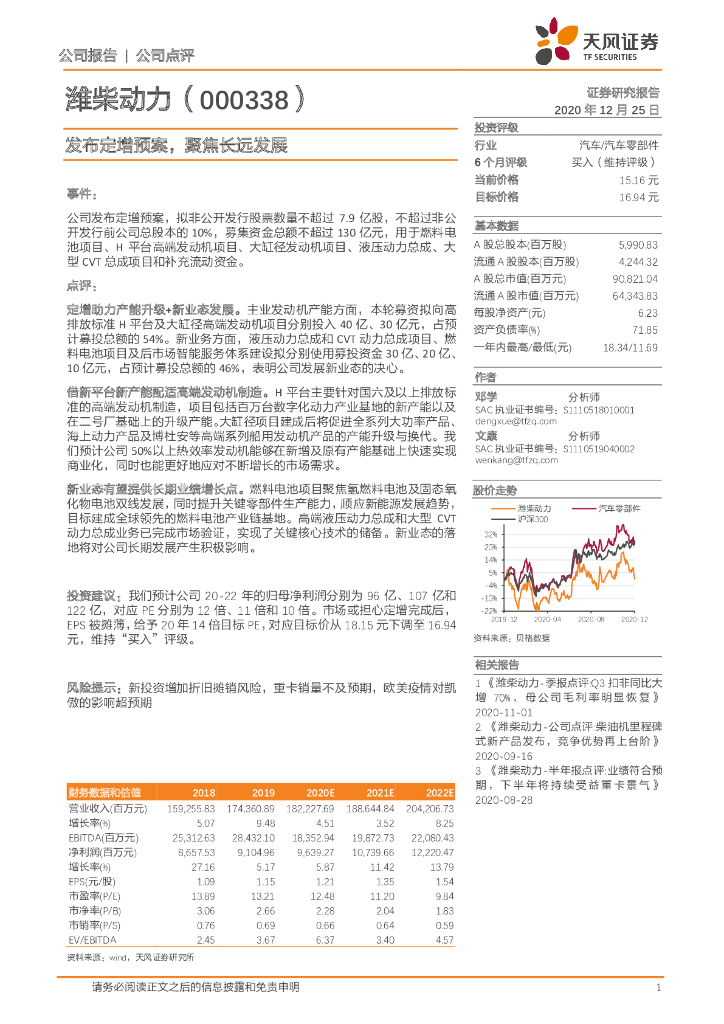 天风证券:潍柴动力(000338)-发布定增预案,聚焦长远发展.pdf