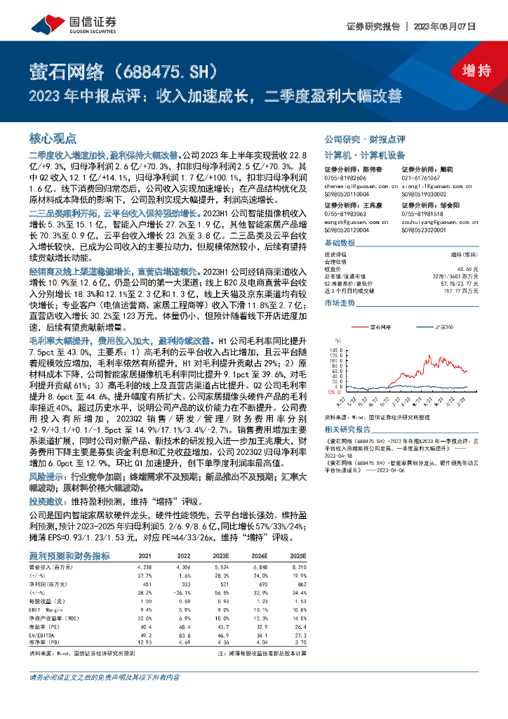 国信证券:萤石网络(688475)-2023年中报点评:收入加速成长,二季度盈利大幅改善.pdf