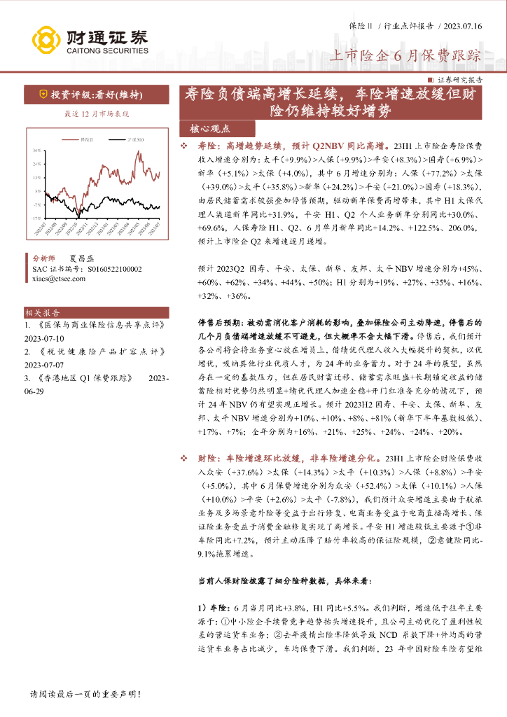 财通证券:上市险企6月保费跟踪:寿险负债端高增长延续,车险增速放缓但财险仍维持较好增势.pdf