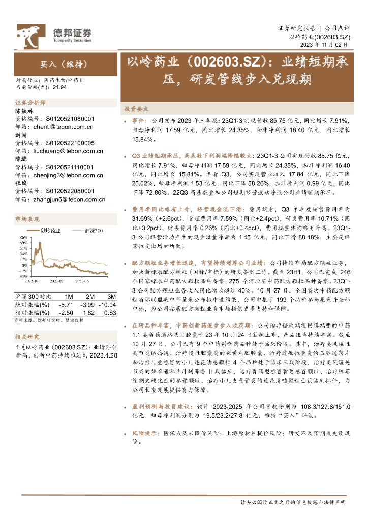 德邦证券:以岭药业(002603)-业绩短期承压,研发管线步入兑现期.pdf