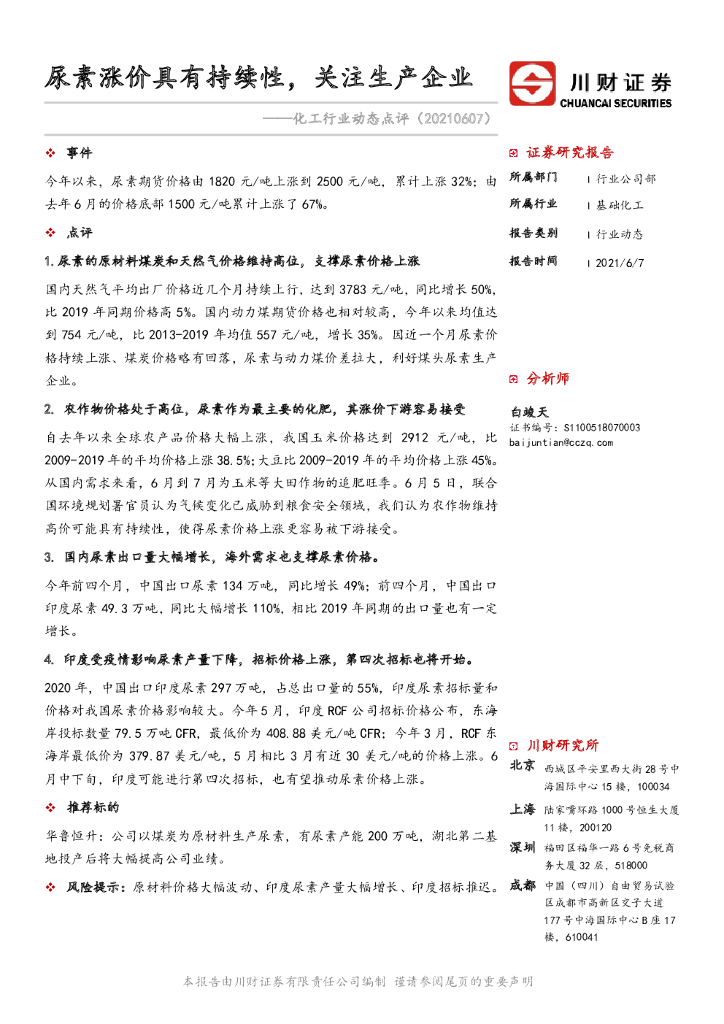 川财证券:化工行业动态点评:尿素涨价具有持续性,关注生产企业.pdf