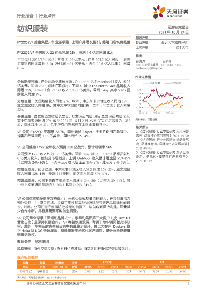 天风证券:纺织服装行业点评:FY22Q2VF威富集团户外业务领跑,上调户外增长指引,终端门店恢复经营.pdf