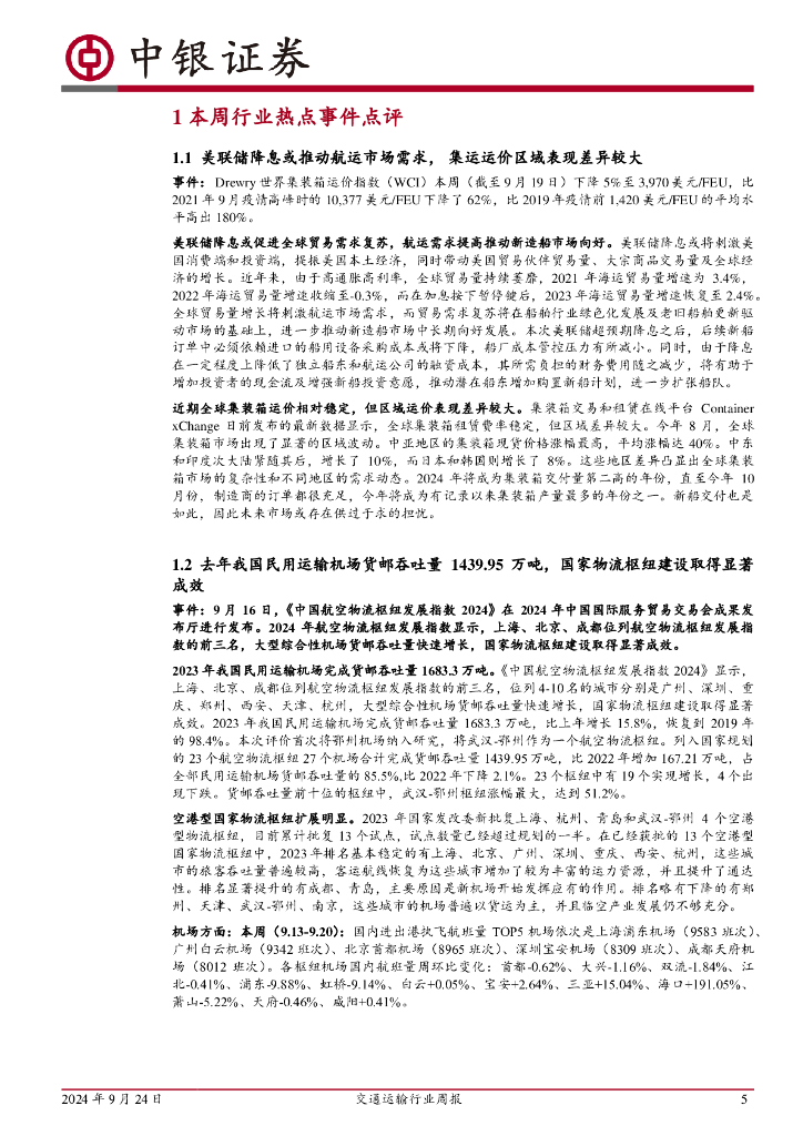 中银证券:交通运输行业周报:美联储降息或推动航运市场需求提升,中秋揽收快递包裹同比增长35.4%.pdf