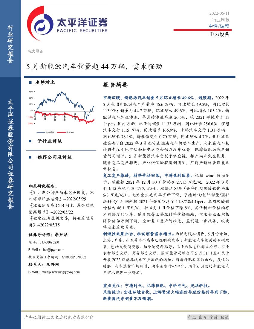 太平洋证券:电力设备行业周报:5月新能源汽车销量超44万辆,需求强劲.pdf
