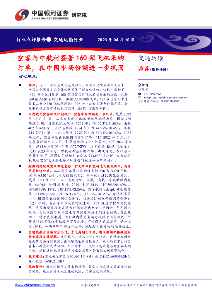 中国银河:交通运输行业:空客与中航材签署160架飞机采购订单,在中国市场份额进一步巩固.pdf