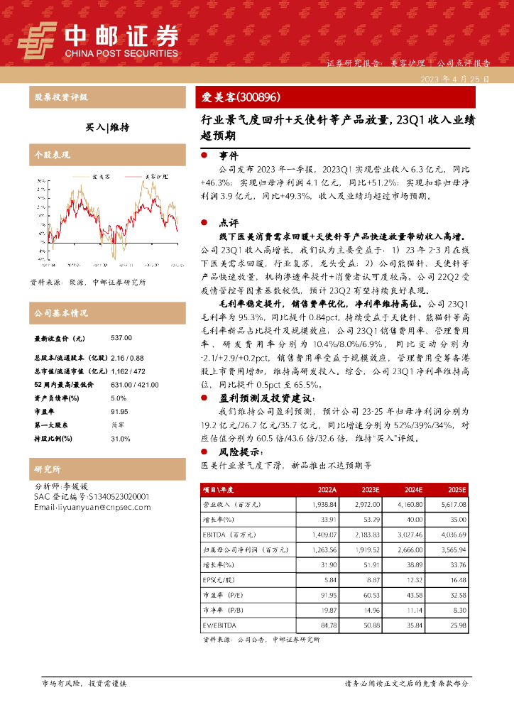 中邮证券:爱美客(300896)-行业景气度回升+天使针等产品放量,23Q1收入业绩超预期.pdf
