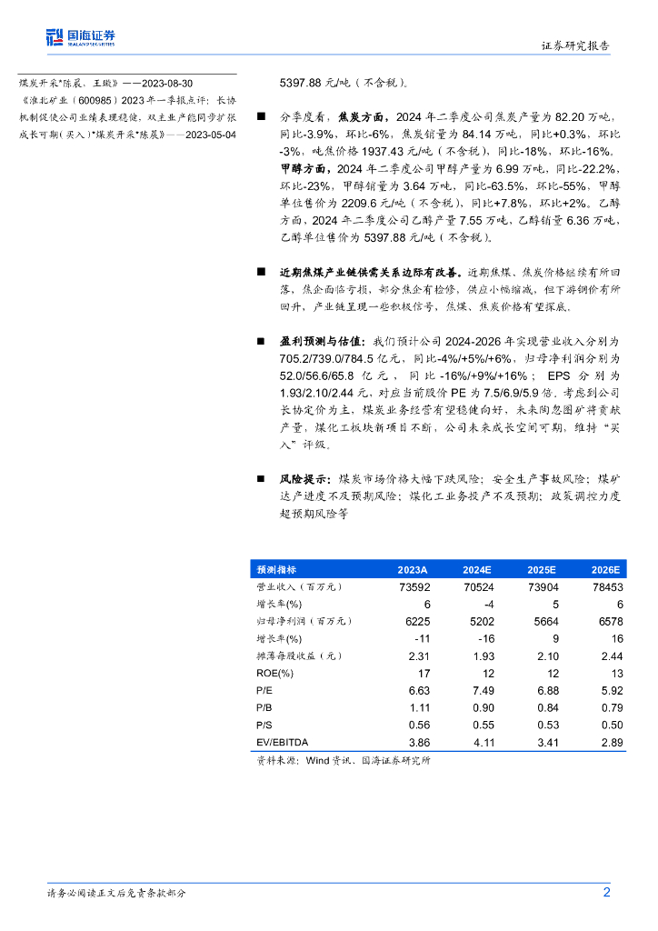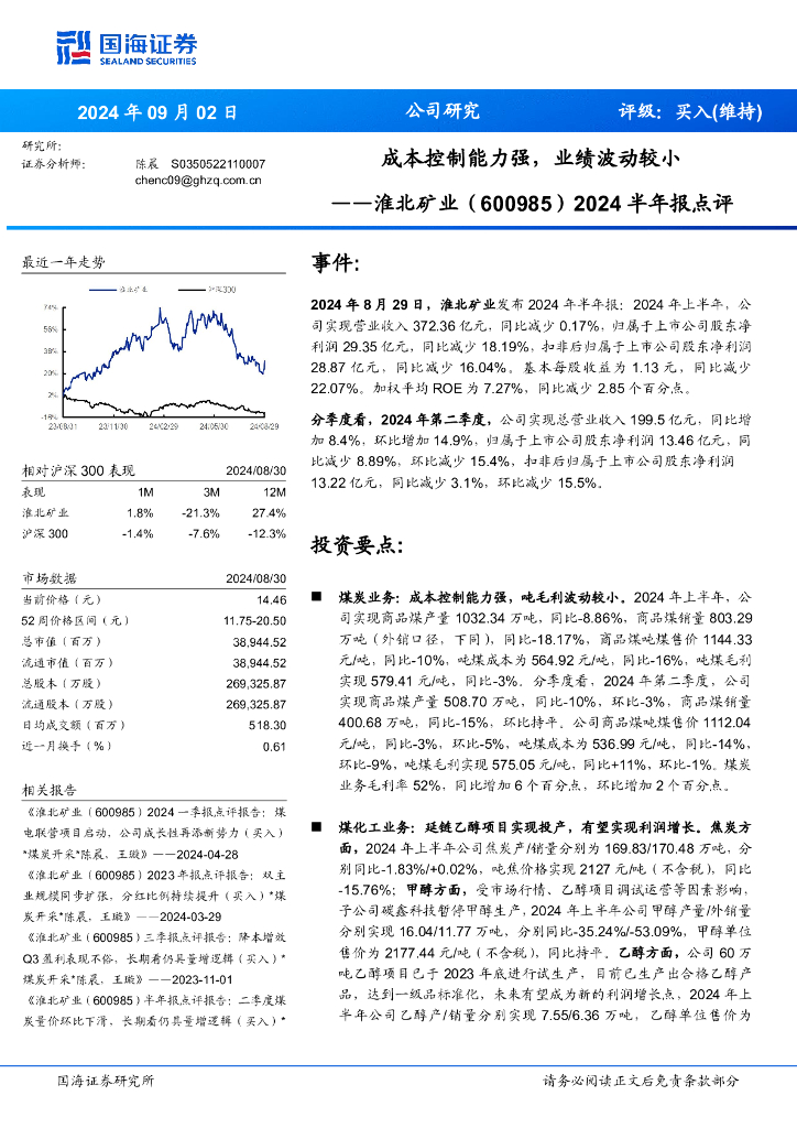 国海证券:淮北矿业(600985)-2024半年报点评:成本控制能力强,业绩波动较小.pdf