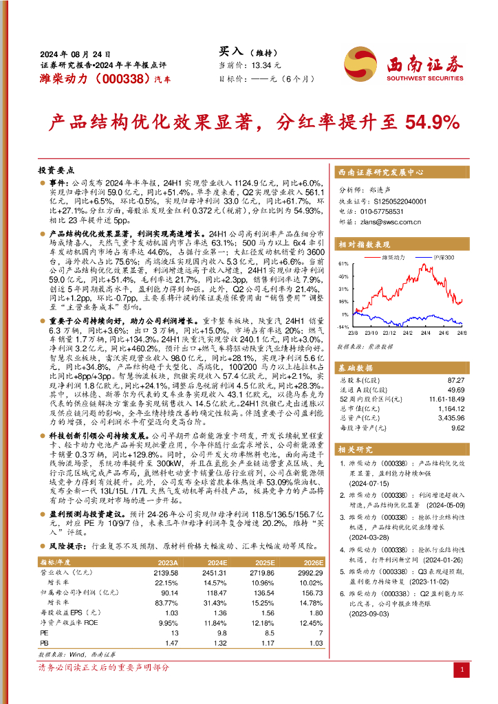 西南证券:潍柴动力(000338)-2024年半年报点评:产品结构优化效果显著,分红率提升至54.9%.pdf