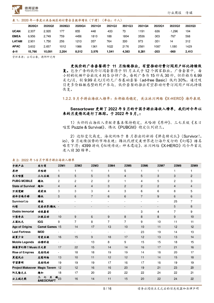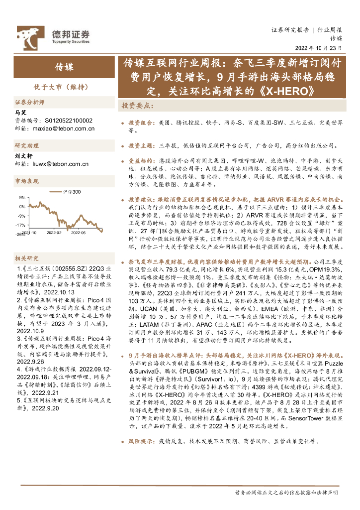 德邦证券:传媒互联网行业周报:奈飞三季度新增订阅付费用户恢复增长,9月手游出海头部格局稳定,关注环比高增长的《X-HERO》.pdf