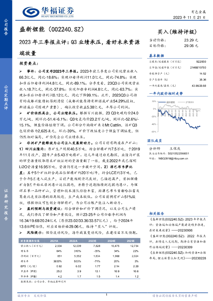 华福证券:盛新锂能(002240)-2023年三季报点评:Q3业绩承压,看好未来资源端放量.pdf