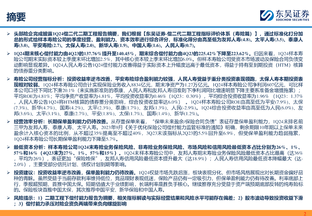 东吴证券:保险II:从1Q24偿二代二期工程季报看头部寿险公司经营质效-投资收益率逆市改善,保单盈利能力仍待改善.pdf