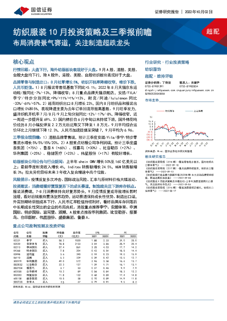 国信证券:纺织服装10月投资策略及三季报前瞻:布局消费景气赛道,关注制造超跌龙头.pdf