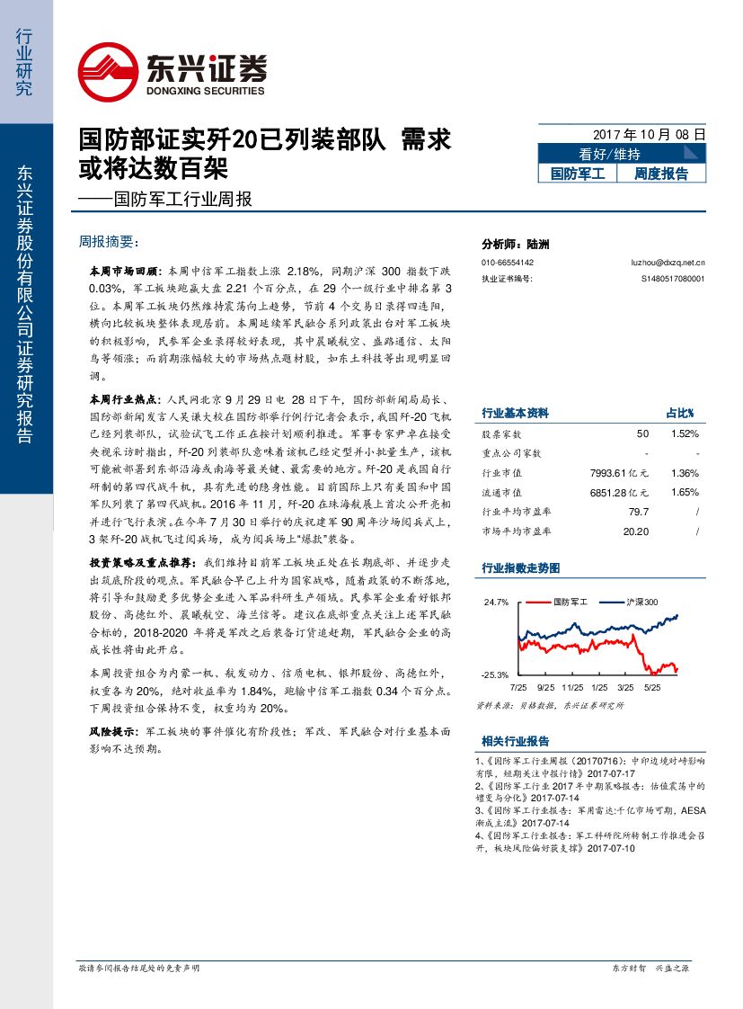 东兴证券:国防军工行业周报:国防部证实歼20已列装部队 需求或将达数百架.pdf