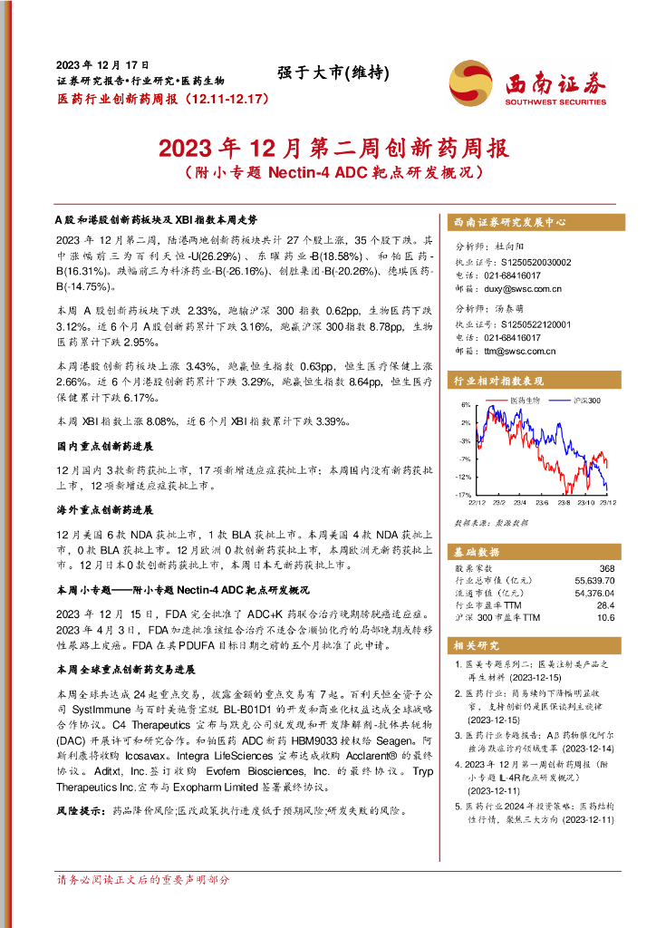 西南证券:医药行业创新药周报:2023年12月第二周创新药周报(附小专题Nectin-4 ADC靶点研发概况).pdf