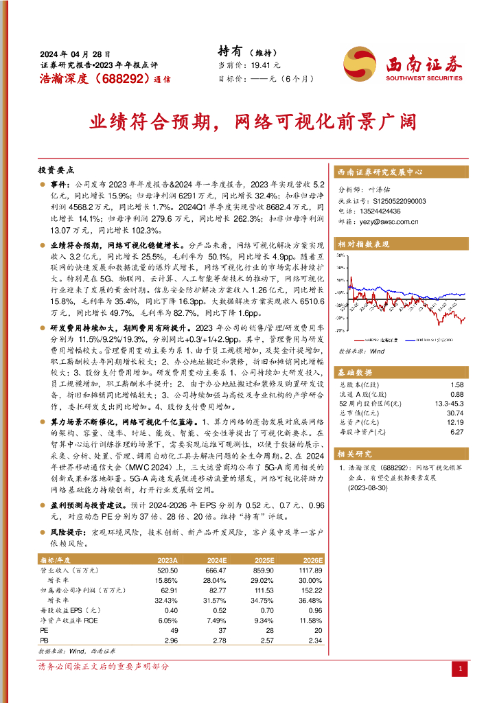 西南证券:浩瀚深度(688292)-2023年年报点评:业绩符合预期,网络可视化前景广阔.pdf