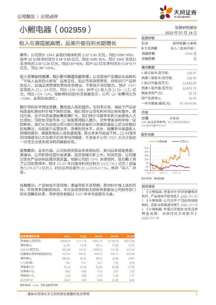 天风证券:小熊电器(002959)-收入有望延续高增,品牌升级有利长期增长.pdf