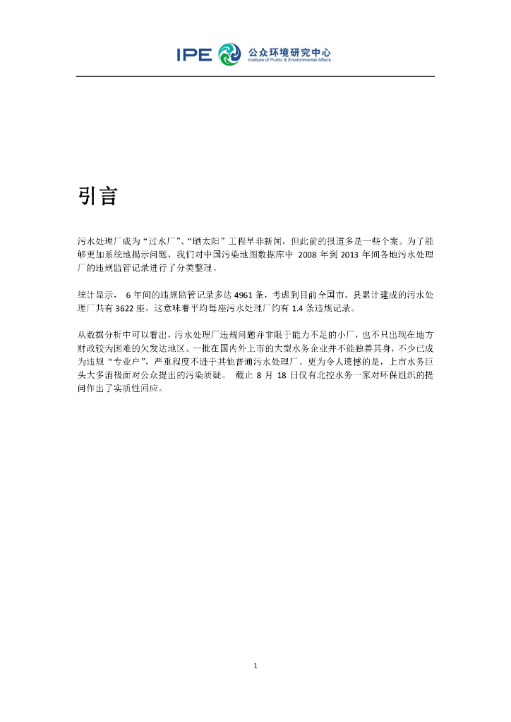 IPE公众环境研究中心:绿色证券行业简报(第1期)--污水处理业:“中外水务上市公司成超标排放大户”.pdf