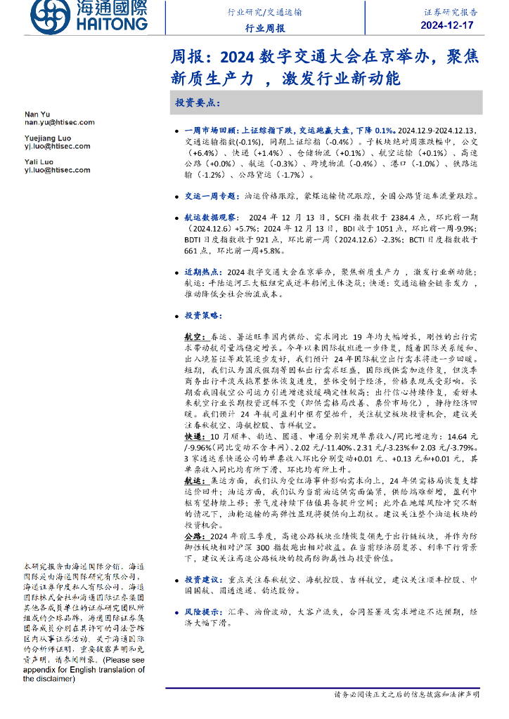 海通国际:交通运输周报:2024数字交通大会在京举办,聚焦新质生产力,激发行业新动能.pdf