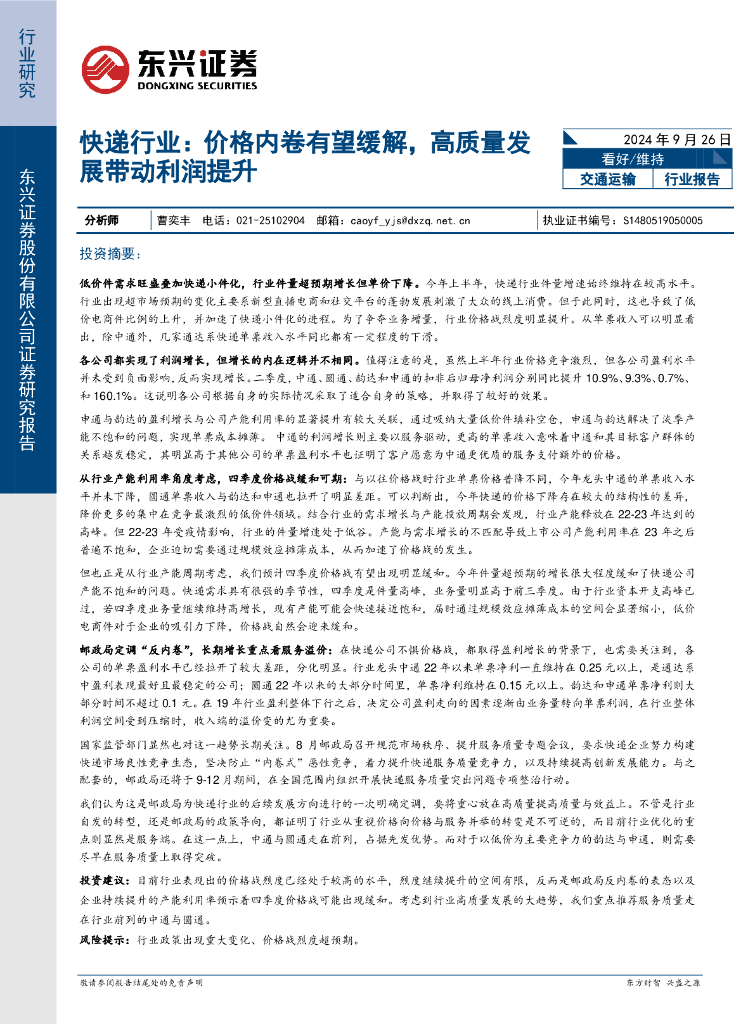 东兴证券:快递行业:价格内卷有望缓解,高质量发展带动利润提升.pdf