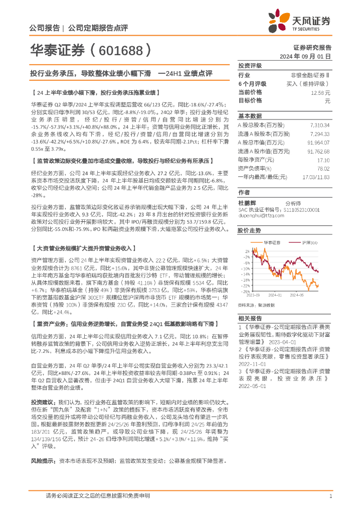 天风证券:华泰证券(601688)-24H1业绩点评:投行业务承压,导致整体业绩小幅下滑.pdf