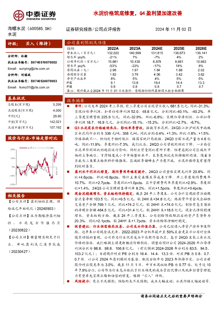 中泰证券:海螺水泥(600585)-水泥价格筑底修复,Q4盈利望加速改善.pdf