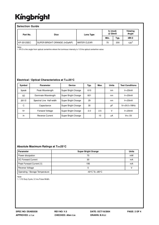 KINGBRIGHT - SPEC NO: DSAB3530 REV NO: V.5 2.0x1.25mm SMD CHIP LED LAMP 数据手册.pdf