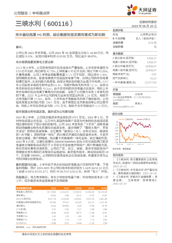 天风证券:三峡水利(600116)-来水偏枯拖累H1利润,综合能源快速发展有望成为新动能.pdf