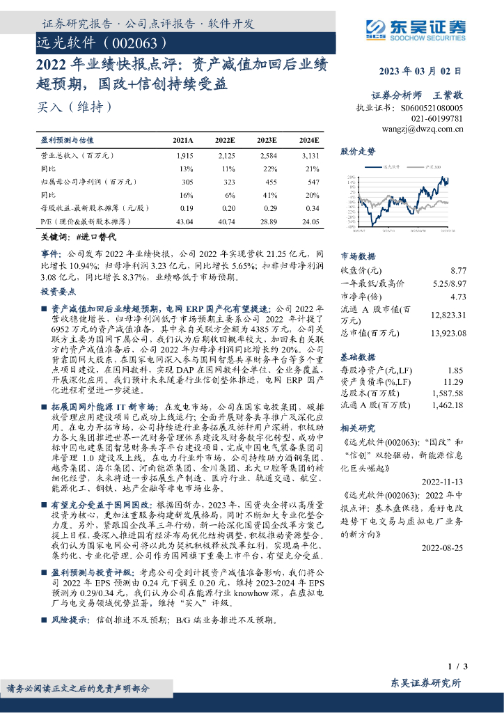 东吴证券:远光软件(002063)-2022年业绩快报点评:资产减值加回后业绩超预期,国改+信创持续受益.pdf