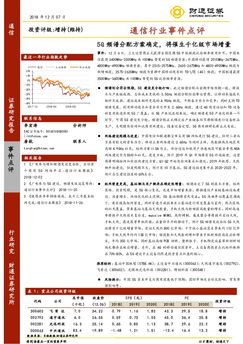 财通证券:通信行业事件点评:5G频谱分配方案确定,将催生千亿级市场增量.pdf