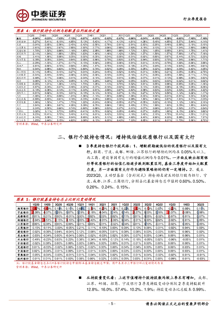 中泰证券:银行行业季度报告:详解基金3Q23银行持仓:继续增持银行股至2.56%,低估值优质银行和大行增配较多.pdf