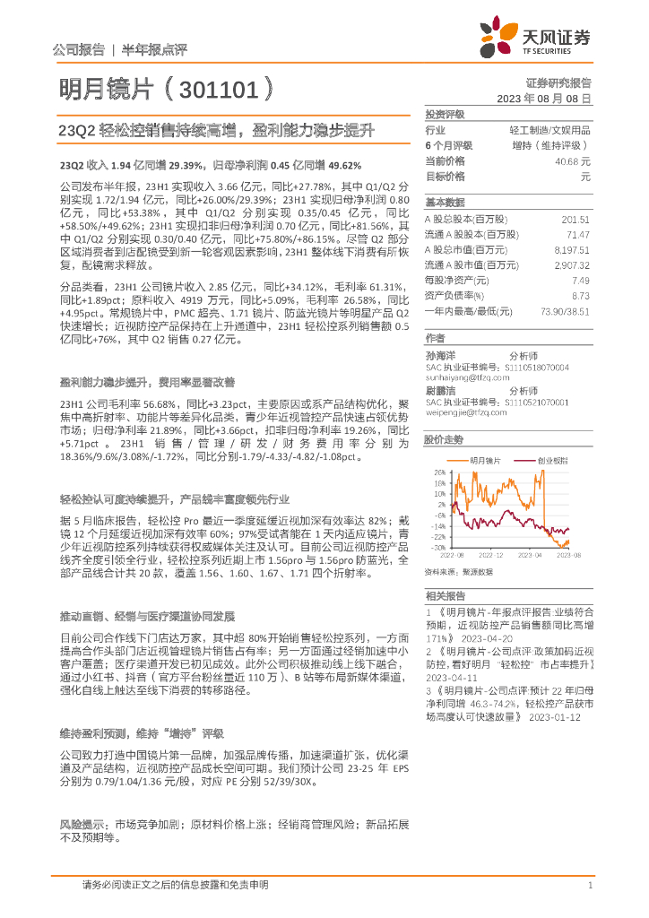 天风证券:明月镜片(301101)-23Q2轻松控销售持续高增,盈利能力稳步提升.pdf