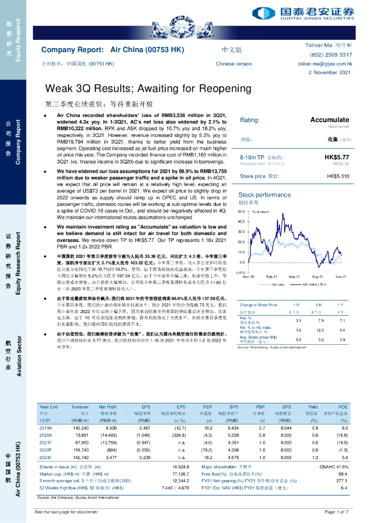 国泰君安证券(香港):中国国航(00753)港股公司研究报告-第三季度业绩疲软;等待重新开放.pdf