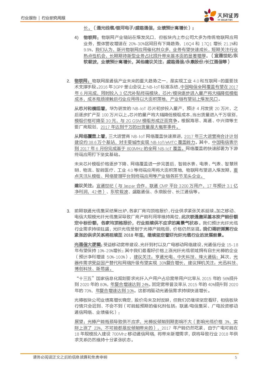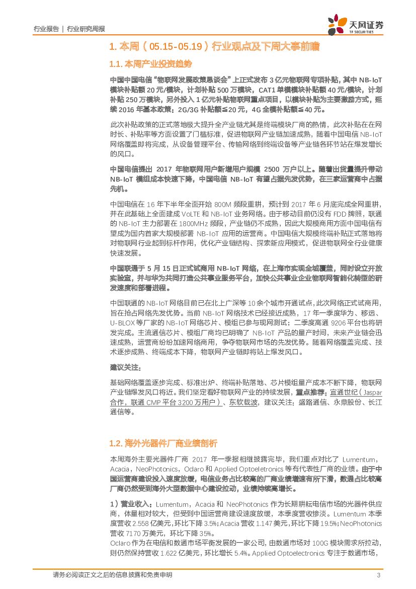 天风证券:通信行业研究周报:电信3亿终端补贴落地,联通NB-IoT正式试商用,物联网风口将近.pdf