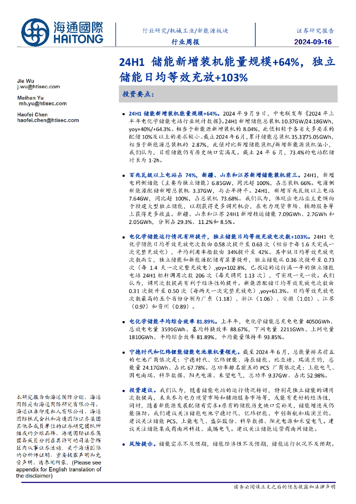 海通国际:新能源板块行业周报:24H1储能新增装机能量规模+64%,独立储能日均等效充放+103%.pdf